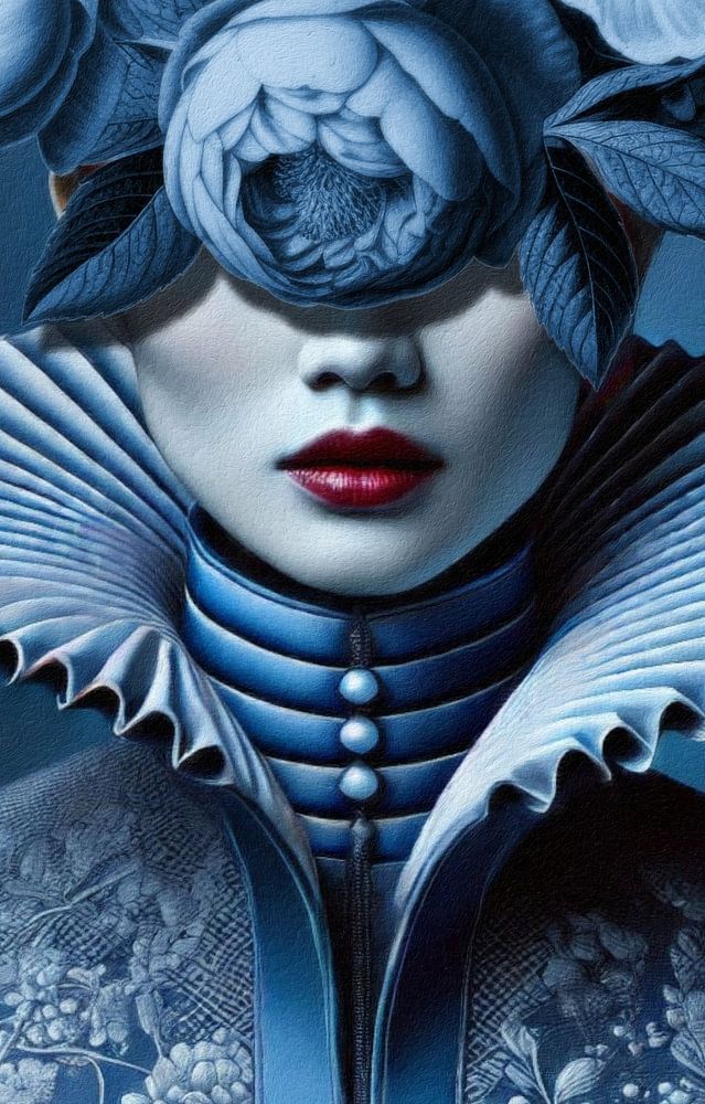Een betoverend en surrealistisch portret van een vrouw, gehuld in een gedetailleerde, Delfts blauwe jas met een rijk bloemmotief. Haar gezicht, mysterieus in de schaduw, wordt omlijst door een majestueuze kraag en een indrukwekkende kroon van monochrome bloemen. De felrode lippen vormen een opvallend contrast en trekken onmiddellijk de aandacht. Dit kunstwerk combineert klassieke portretkunst met een moderne, surrealistische flair, wat zorgt voor een krachtige en elegante uitstraling.