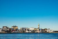 Koop de foto Blick auf Warnemünde mit Leuchtturm van Rico Ködder op canvas, aluminium dibond, (ingelijste) fotoprint, behang en ArtFrame, op maat geprint in Fine-Art kwaliteit.