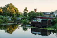 Blick über die Warnow auf den Wasserturm in der Hansestadt Rostock.