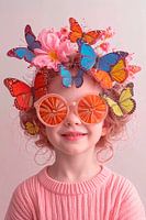 Een mooi meisje, met een roze bril op met glazen van fruitschijfjes. Haar krullende haren zitten vol met vlinders en roze bloemen. Zij heeft een roze gebreide trui aan en zij glimlacht, een blij kind. Een surrealistische , dromerige, fictieve sfeer waar je blij van wordt. Het beeld is met behulp van ai gegenereerd.