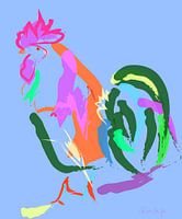 Modern kunstwerk van een blijde haan. Ferme kwaststreken en sterke kleuren laten deze trotse haan schijnen. De meest gebruikte kleur is hier blauw.