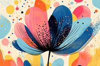 De oversized bloemblaadjes in rijke tinten roze, marine en hemelsblauw stralen vanuit een donker centrum, geaccentueerd met dynamische inktlijnen en speelse verfspatten. Zwevende stippen en organische vormen in geel, koraal en turquoise creëren een levendige achtergrond die de expressieve vorm van de bloem versterkt.