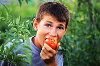 Koop dit portret Blije jongen bijt in de tomaat van Besa Art als print op canvas, aluminium dibond, (ingelijste) fotoprint, behang en ArtFrame. Voor jou op maat geprint in Fine-Art kwaliteit.