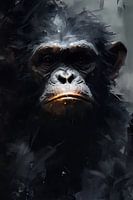 Blik van Chimpansee - Dit meeslepende portret van een chimpansee boeit met zijn intense blik en levensechte expressie. De kunstenaar heeft gebruikgemaakt van een beperkt kleurenpalet, waarbij zwart, wit en grijstinten domineren met subtiele oranje accenten die de blik naar de ogen en het gezicht leiden. De brede, dynamische…