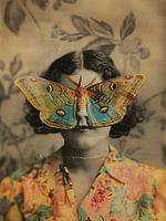 Dit betoverende, vintage kunstwerk portretteert een handgekleurde foto uit de jaren '30 van een vrouw wiens gezicht bedekt is met een opvallend grote vlinder.