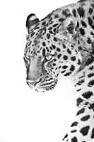 Blik van een luipaard die vooruit in een semi-profile zwart-witfoto loopt, witte achtergrond