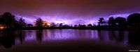 Nachtelijk onweer met bliksem over meer met weerspiegeling