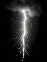 'Bliksem' is een zwart-wit foto van een bliksemschicht die vanuit de wolken verschijnt