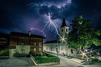 Koop de foto Bliksemschicht boven kerkje in Unterbäch van Ad Van Koppen Fotografie op canvas, aluminium dibond, (ingelijste) fotoprint, behang en ArtFrame, op maat geprint in Fine-Art kwaliteit.