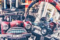 Doorkijk en herhaling door winkelruit. Veel te zien en artistieke vrijheid het beeld bewerkt zodat het een oude uitstraling heeft. In de weerspiegeling zie je he winkelend publiek voorbijlopen maar de auto blijft de blikvanger. Letterlijk en figuurlijk.