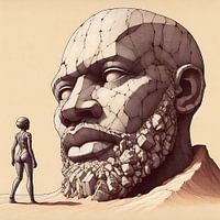 Een vrouw in een jumpsuit staat voor een groot stenen hoofd van een man met een baard en witte ogen, alsof hij blind is.