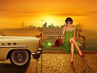 Sexy Pin-up meisje op een bankje naast een klassieke auto. Op de achtergrond de skyline bij zonsondergang.