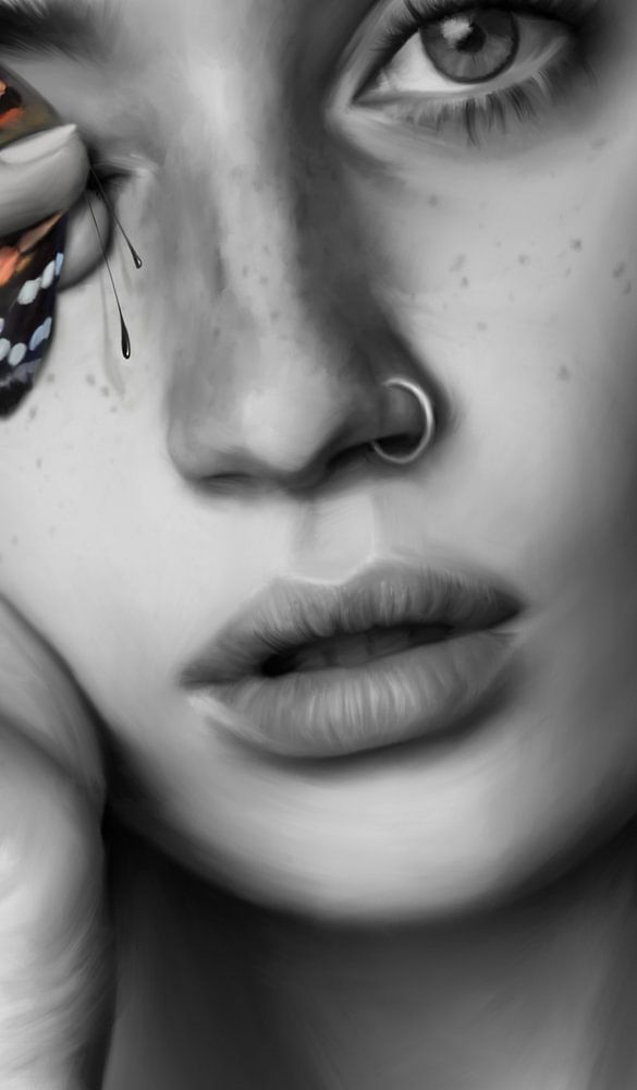 De vlinder, het enige element van kleur, belichaamt de geest van transformatie, vrijheid en wedergeboorte. Hij valt op in de grijstinten van het doek en symboliseert het potentieel voor verandering en groei, zelfs in de somberste omstandigheden.