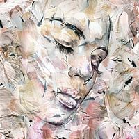 Mixed media schilderij in zachte pasteltinten,abstract portret van een serene vrouw met lijntekening en grove verf penseelstreken.
