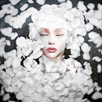 Abstract fantasie portret van een vrouw omringd door bewegende witte roosblaadjes.