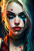 Ons motief toont Harley Quinn met bloedspetters en felle kleuren als een dynamisch en dramatisch kunstwerk.