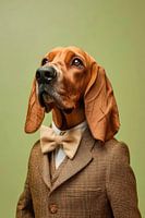Hij is een imposant wezen met zachte, flaporen en lijkt op een elegante detective uit een oude misdaadfilm. Het mooie pak en de stijlvolle vlinderdas geven hem een charmante, gedistingeerde uitstraling, terwijl de diepe ogen de wereld wetend aankijken. Deze Bloedhond combineert gratie en intelligentie op een unieke manier - een echte aristocraat onder de honden.