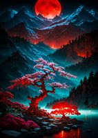Een mystieke bloedrode maan komt op boven gloeiende kersenbloesems en torenhoge bergen en verlicht een vallei van surrealistische schoonheid. Stap in een wereld van mythe en verwondering. Onder de torenhoge bergen gloeien eeuwenoude kersenbomen met een buitenaardse uitstraling. Daarboven werpt een karmozijnrode bloedmaan haar spookachtige licht over de vallei, waardoor het landschap vuur en mysterie uitstraalt. Dit kunstwerk versmelt Japanse natuurlijke schoonheid met fantasiesurrealisme en creëert een adembenemende visie die zowel oud als kosmisch aanvoelt. Perfect voor dromers, verhalenvertellers en liefhebbers van epische landschappen.