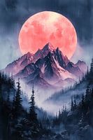 Een adembenemend landschap waarin een enorme, roze-rode maan oprijst achter majestueuze bergtoppen. De bergen worden gehuld in een mysterieuze mist, terwijl donkere dennenbomen de voorgrond sieren. Het contrast tussen de warme tinten van de maan en de koele, blauwe schaduwen van de vallei creëert een surrealistisch en betoverend tafereel.