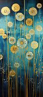 Bloei | Floral Blue Gold - Het werk toont een verticale tuin van gestileerde bloemen, in gouden en witte tinten die afsteken tegen een diepblauwe achtergrond, met elementen die doen denken aan paardenbloempluisjes. De combinatie van strakke lijnen en spetters zorgt voor een dynamische en toch elegante uitstraling.
