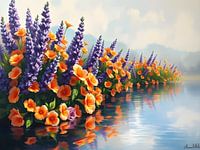 Een levendig digitaal schilderij met een weelderig arrangement van paarse lupines en fel oranje klaproosachtige bloemen die langs de rand van een sereen waterlichaam groeien. De bloemen worden weerspiegeld in het kalme water's oppervlak, waardoor een spiegelend effect ontstaat. Op de achtergrond zie je een zachte, wazige lucht met…