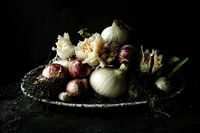 Een verfijnd en poëtisch stilleven waarin witte en rode uien samenkomen met bloeiende bloemblaadjes in een keramieken schaal. De glanzende schillen, tere bloeiwijzen en loshangende wortels vormen een harmonieuze compositie die doet denken aan de Hollandse meesters. Het clair-obscur licht zorgt voor een dramatische, intieme sfeer, waarin de texturen en kleuren tot leven komen. Deze compositie verenigt het alledaagse met het esthetische — een ode aan vergankelijkheid, schoonheid en eenvoud. Een werk dat rust en klasse brengt in elk interieur.