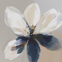 Grote, centraal geplaatste bloem in een abstract-realistische stijl, waarbij zachte penseelstreken en vloeiende vormen de bloemblaadjes tot leven brengen. De bloembladen zijn wit tot crème van kleur, met accenten in donkerblauw, beige en een vleugje paars. De achtergrond is neutraal en egaal, waardoor alle aandacht naar de bloem zelf…