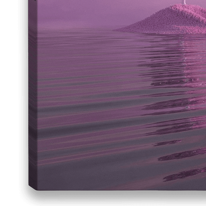Een eenzame, etherische boom met delicate roze bloesems staat bovenop een klein, zacht glooiend eiland omringd door kalm, reflecterend water. Het tafereel baadt in zachte tinten lavendel en roos, wat een rustige en dromerige sfeer creëert. De lucht erboven is een mengeling van pastelkleurige wolken, wat bijdraagt aan het algehele gevoel…