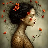 “Bloei van Stilte” is een zintuiglijke verbeelding van innerlijke rust en vrouwelijke kracht. In dit betoverende digitale kunstportret zie je een jonge vrouw in zijaanzicht, haar ogen gesloten, gevangen in een dromerige staat van harmonie. Fijne zwarte lijnen omhullen haar als een etherisch web, waaruit vurige oranje bloemen ontspringen…