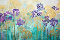 Bloei - Dit schilderij toont een weelderige compositie van bloemen in een gedurfde paarse toon, omlijst door gouden bloemmotieven tegen een zachtgemengde achtergrond van turkoois en blauwe tinten. De artistieke flair van het stuk wordt versterkt door een subtiele textuur die doet denken aan gemengde media kunst, terwijl de gouden accenten een vleugje verfijning toevoegen.