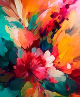 Abstract schilderij met lentebloemen in heldere kleuren. Dit werk is een digitale creatie welke met een Ai programma tot stand kwam en nabewerking kreeg om de kleuren en contrasten in de juiste balans te brengen. Een klassieke kunstvorm met de modernste techniek vorm gegeven.