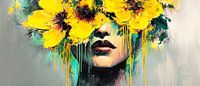 Hier ontvouwt zich een stralend samenspel van levendig geel en zachte kleurtonen. De bloemen verbergen zachtjes het gezicht en geven het motief een mystieke uitstraling. Deze levendige compositie brengt frisse energie en levensvreugde en is perfect voor een creatieve woonkamer of een inspirerend kantoor waar het de verbeelding kan stimuleren.