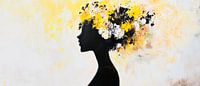 Een fascinerend spel van schaduwen en kleuren: Het silhouet van een vrouw, bekroond door heldergele en witte bloemen, straalt creativiteit en levensvreugde uit. Dit kunstwerk brengt een vleugje frisheid in elke woonkamer en nodigt uit tot inspiratie. Perfect om een kamer om te toveren in een oase van rust en schoonheid.