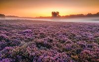 Bloeiend heideveld bij zonsopkomst met mist in natuurgebied de Renderklippen bij Heerde in Gelderland.