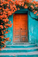 Een betoverende foto van een rustieke houten deur in zacht oranje, omlijst door felrode bloemen die tegen de blauwe gevel opklimmen. De treden die naar de deur leiden zijn uitnodigend, terwijl de bloeiende pracht een gevoel van warmte en gastvrijheid uitstraalt. Een harmonieus samenspel van kleur en textuur dat inspireert tot dromen.