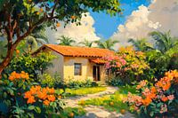 Een uitnodigend toevluchtsoord, omringd door weelderig groen en een bloemenpracht. De warme kleuren van het dak harmoniëren met de zachte sereniteit van de muren, terwijl het pad door de bloeiende oase naar een knusse ingang leidt. De wolken aan de hemel beloven een stralende dag die wacht om ontdekt te worden.
