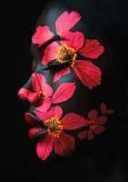 portretkunst met florale abstractie en creëert daarmee een adembenemend visueel effect. Het gezicht, dat is afgebeeld tegen een zwarte achtergrond, straalt elegantie en kracht uit. De donkere huidtinten worden prachtig geaccentueerd door felrode bloemen met gele centra, die over het gezicht lijken te groeien als een natuurlijk masker.…