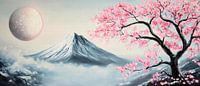 Zachte pastelkleuren creëren een droomlandschap waarin majestueuze bergen en bloeiende kersenbomen harmonieus samensmelten. De stralende maan hoog aan de hemel geeft het tafereel een mystiek aura. Dit kunstwerk is perfect voor de woonkamer en nodigt je uit om je onder te dompelen in een oase van rust en inspiratie.