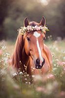 Een majestueus paard schittert te midden van zachte weidebloemen, zijn glanzende, kastanjebruine vacht glinstert in het zonlicht. Een betoverende bloemenkrans siert zijn hoofd en verleent hem een charmante gratie. Zijn zachte blik en trotse oren weerspiegelen de rust en schoonheid van de natuur, terwijl de bloemen hem omarmen en een magische sfeer creëren.