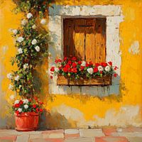 Fel geel straalt warmte uit en omarmt de oude houten deur, die nostalgische verhalen vertelt. Weelderige bloemen in een bloeiende bloembak en een mandachtige pot op de voorgrond geven het tafereel levendige kleuren en frisheid. Boven het raam kronkelt groen leven, dat de rust en schoonheid van een harmonieus moment vastlegt.