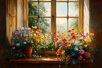 Een betoverend raam opent naar een bloeiend paradijs. Kleurrijke bloemen in levendige tinten sprankelen van frisheid en levensvreugde, terwijl zacht licht door de oude luiken stroomt. De kamer ademt de essentie van natuur en geborgenheid, uitnodigend en vol verhalen verborgen in elk bloemblaadje.