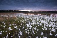 Massaal bloeiend veenpluis met dreigende luchten aan de rand van een Brabants ven.