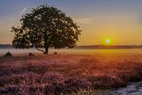 Deze foto van de bloeiende heide bij Bussum is gemaakt tijdens zonsopkomst op 29 augustus 2024. Een heerlijke plaat van een natuurlandschap voor aan iedere muur. We zien een eenzame boom halverwege in paarsgekleurde heide. De zon komt net boven de kim uit en kleurt de lucht en het landschap in prachtige tinten. De nevel die over een gedeelte van de heide hangt, vervolmaakt het beeld!