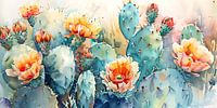 Het stelt een groep bloeiende cactussen voor, elk uniek in vorm en grootte, tegen een zacht gekleurde achtergrond die de eindeloze hemel van de woestijn suggereert. De bloemen variëren van dieprood tot zachte pastel roze en levendig oranje, en staan in schril contrast met de koelere blauw groene tinten van de cactuslichamen. Dit spel van warme en koele kleuren brengt het tafereel tot leven, waarbij de losse, expressieve penseelstreken beweging en energie toevoegen. Spatten en druppels verf over het doek versterken het spontane en ongetemde karakter van zowel de kunstvorm als het onderwerp.