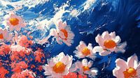 Het kunstwerk toont een levendige compositie van bloemen op een expressieve blauwe achtergrond.