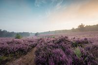 Bloeiende Heide op de Utrechtse Heuvelrug. Met een mooie kleurende lucht en een klein beetje mist een kleurrijk tafereel.