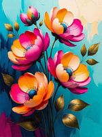 Een levendig en gestileerd schilderij met een cluster fuchsia- en oranjekleurige bloemen met een opvallend blauw hart tegen een dynamische turquoise en gele achtergrond. De penseelstreken zijn zichtbaar, waardoor het stuk een getextureerde, schilderachtige uitstraling heeft, en de metallic gouden bladeren voegen een vleugje elegantie…