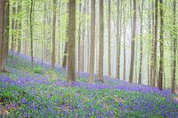 Wilde hyacinten bloemen bloeien in een beukenbos tijdens een mistige lentemorgen in het Hallerbos in België.