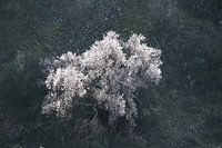 Van bovenaf geziene amandelboom. De top van de boom vangt de eerste zon waardoor de bloesem oplicht.