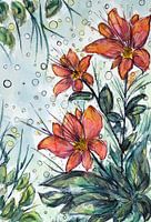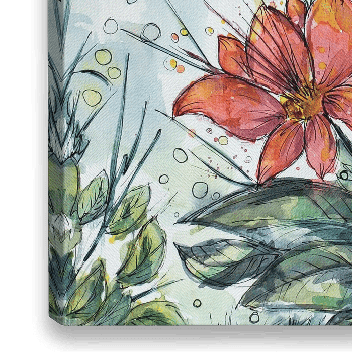 traditioneel aquarelkunstwerk van rood- tot oranjekleurige bloemen die uit dikke groene bladeren en stengels groeien.